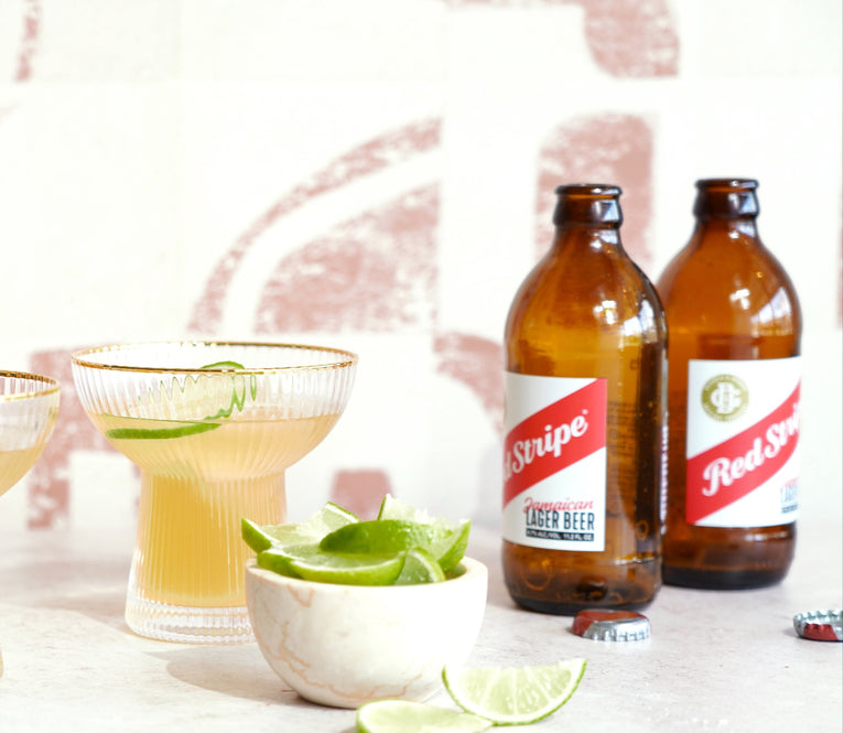 Classic island flavors and a nice, refreshing kick combine for a tasty sipper. We love the combination of lime and ginger, which pair well with the rum and maltiness of the red stripe beer. It's a delicious drink to serve up if you're grilling outdoors or just relaxing on the porch.