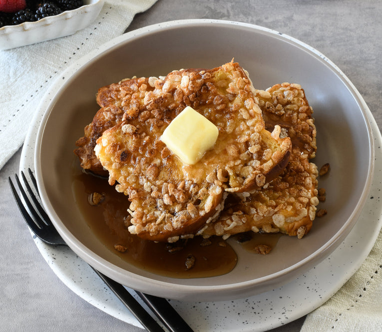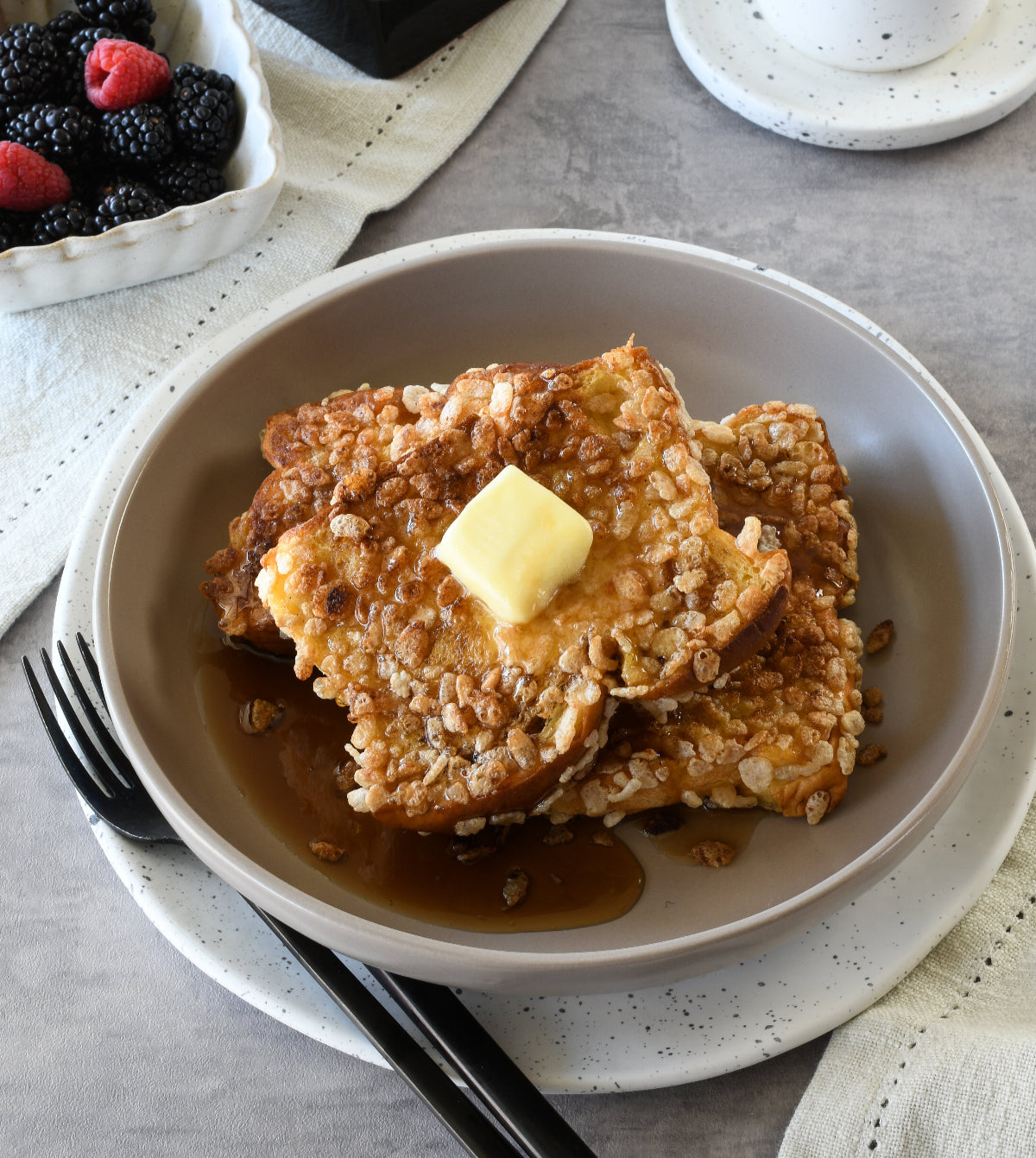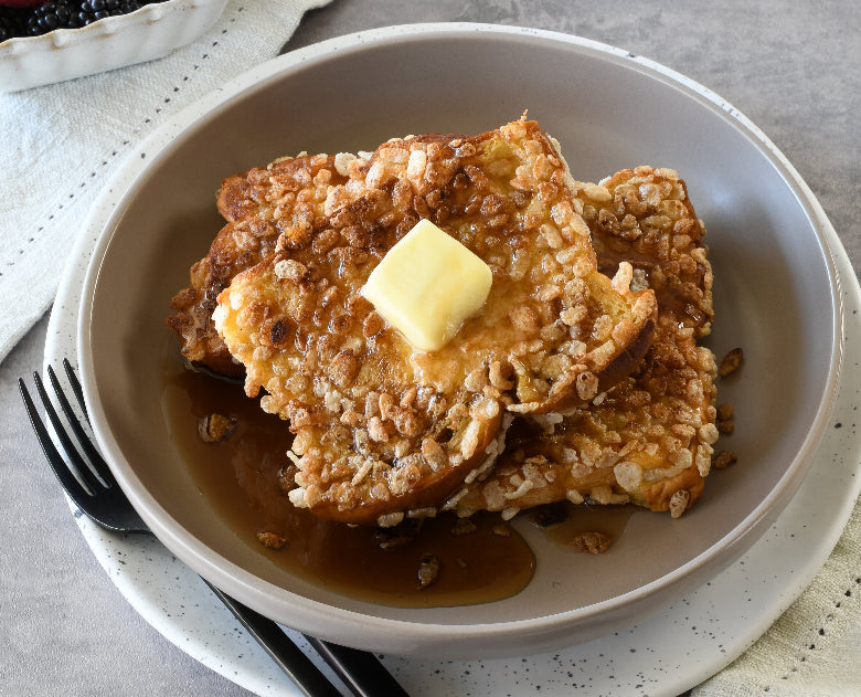 The key to getting the special cereal coating nice and crunchy is making sure the heat of the pan is just right. If your slices of bread are very thick, we recommend heating your oven to low and letting the French toast finish baking in the oven, which will ensure your bread is cooked through without the outer coating burning. If you're serving French toast for a group, it's also a great method to make a big batch and keep everything warm. Serve this up with a vanilla and bourbon-infused maple syrup that will have you scraping the bottom of your plate for every last drop.