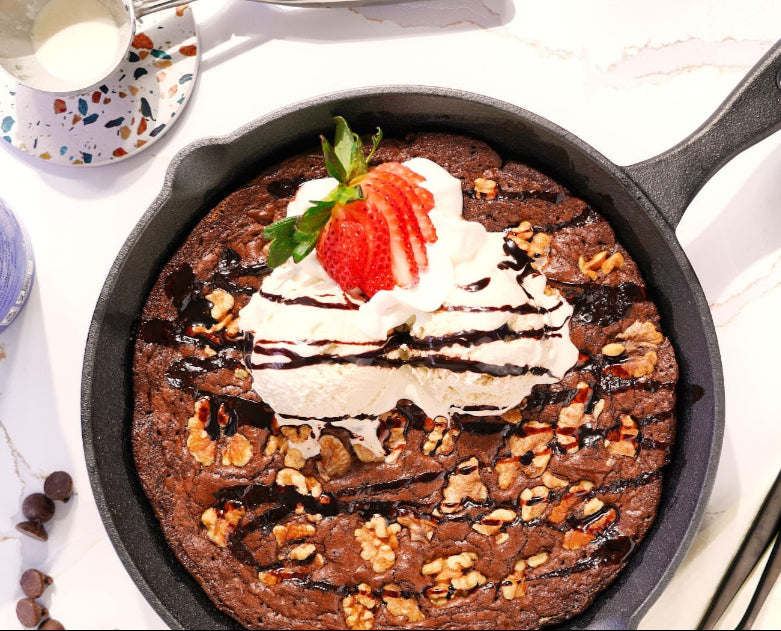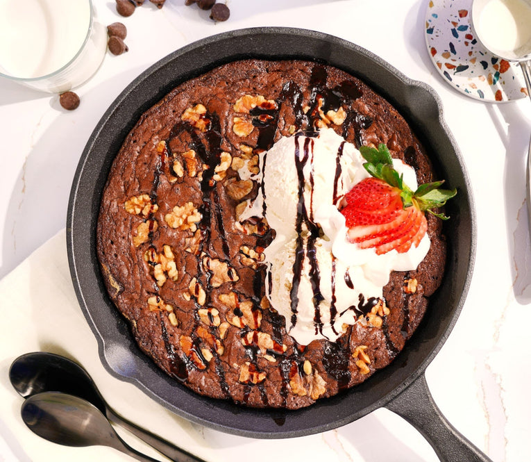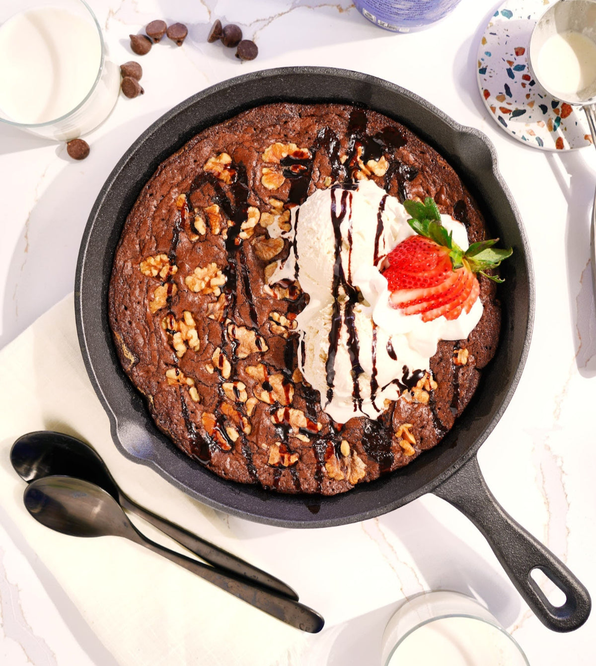 This is best served warm (with optional sundae toppings to finish things off), but up to you whether you want to cut into slices or dive right in with spoons for a family-style dessert.
