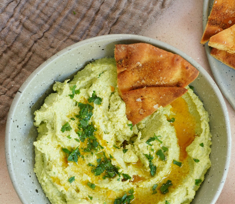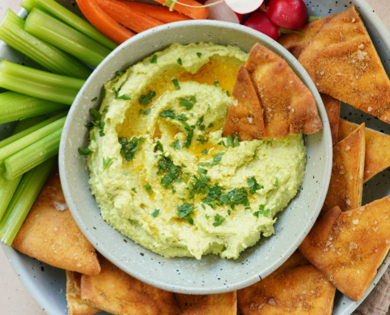 Serve alongside homemade spiced pita chips (recipe below) and veggies, or your favorite side pairing combos. Shop featured products: Sweet July Edgewater Collection Bowl and the Sweet July Edgewater Collection Serving Bowl.