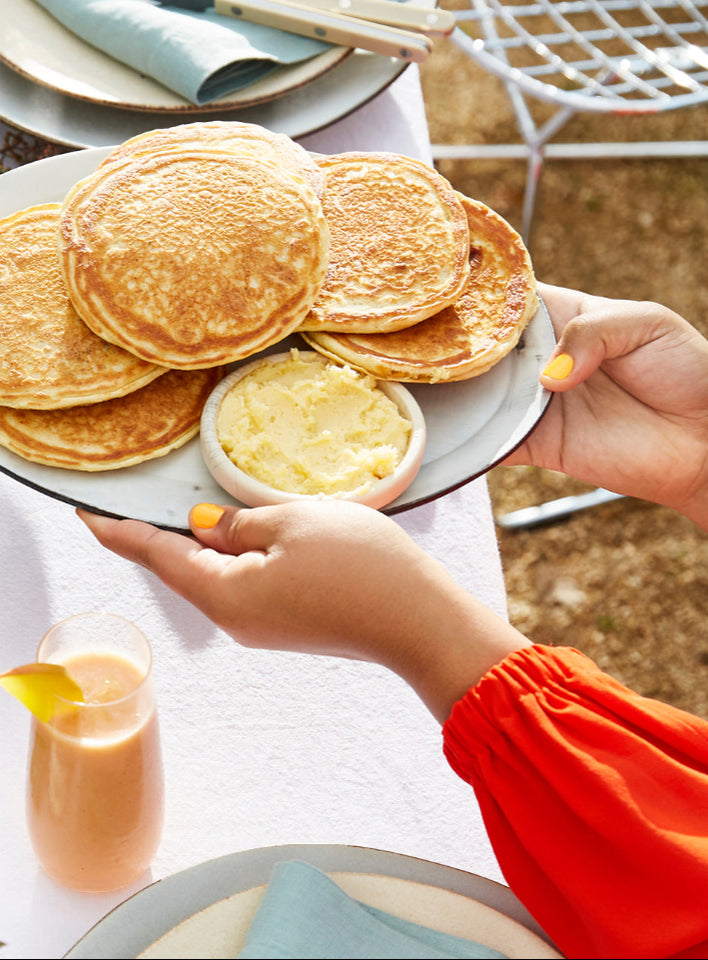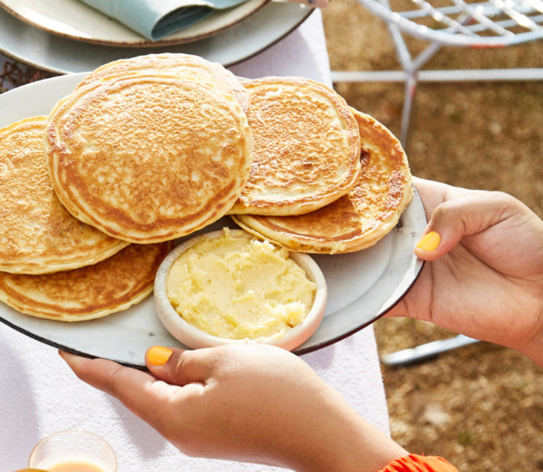 The key to a perfect pancake is all in the texture, a perfect balance of moistness and airiness. The ricotta cheese helps to achieve that while the lemon adds a bright, citrusy flavor. Start with cold butter in your skillet when it’s time to fry so that the pancake has time to cook without the butter burning. For serving, make sure to be generous with the honey butter and use a pure, high quality maple syrup. Our Canadian founder takes her maple syrup very seriously and recommends you do the same.
