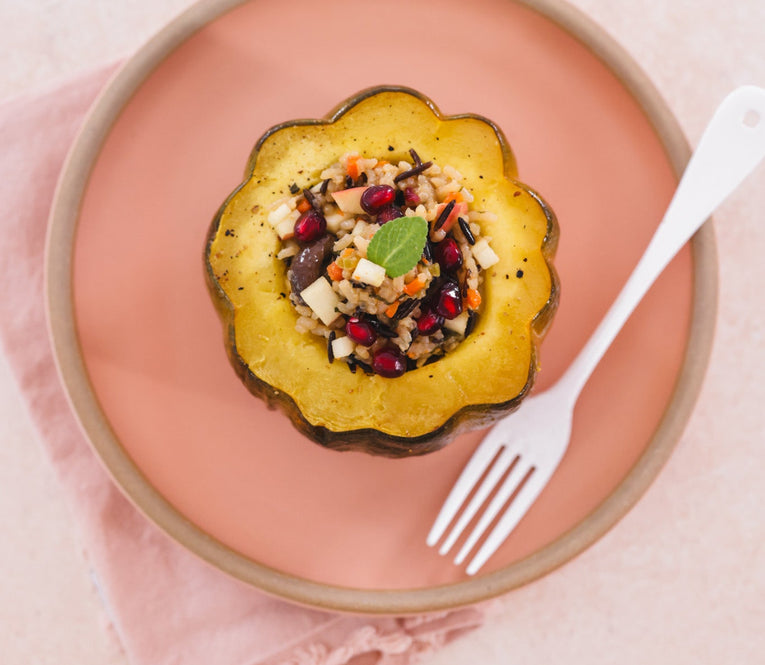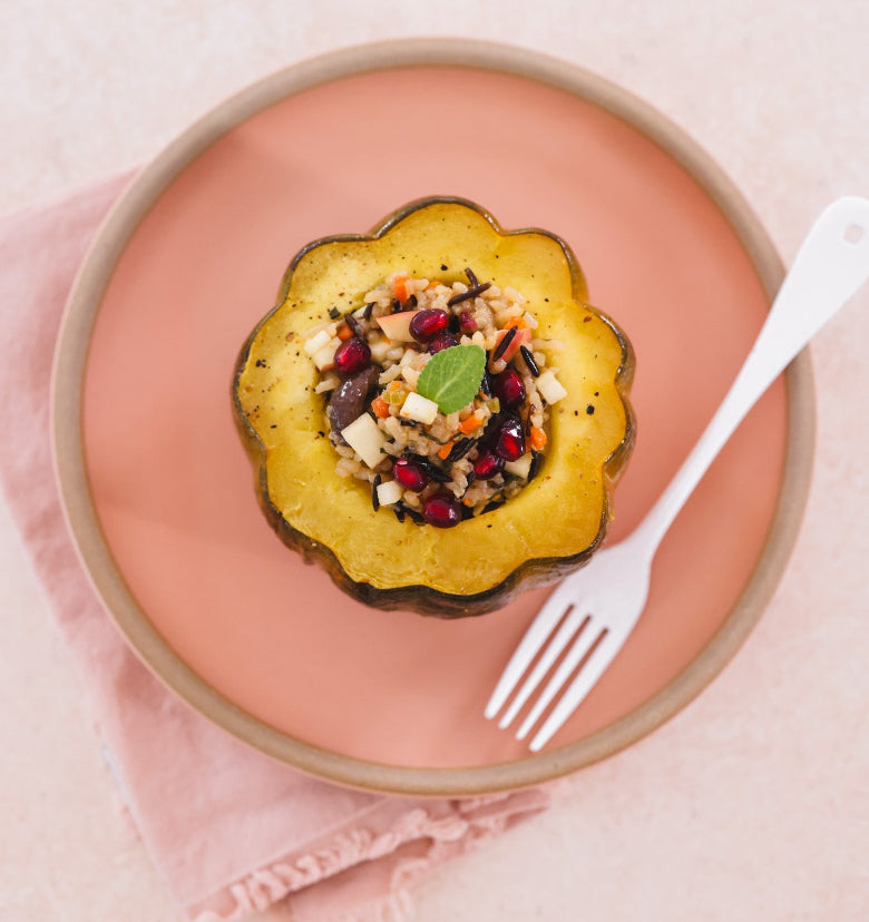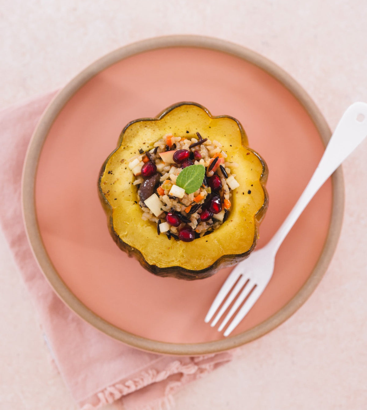 Roasted acorn squash becomes the perfect edible bowl for a hearty wild rice stuffing packed with mushrooms, herbs, apples, and a pop of pomegranate for brightness. It’s comforting, colorful, and deeply satisfying, with layers of texture and flavor in every bite.