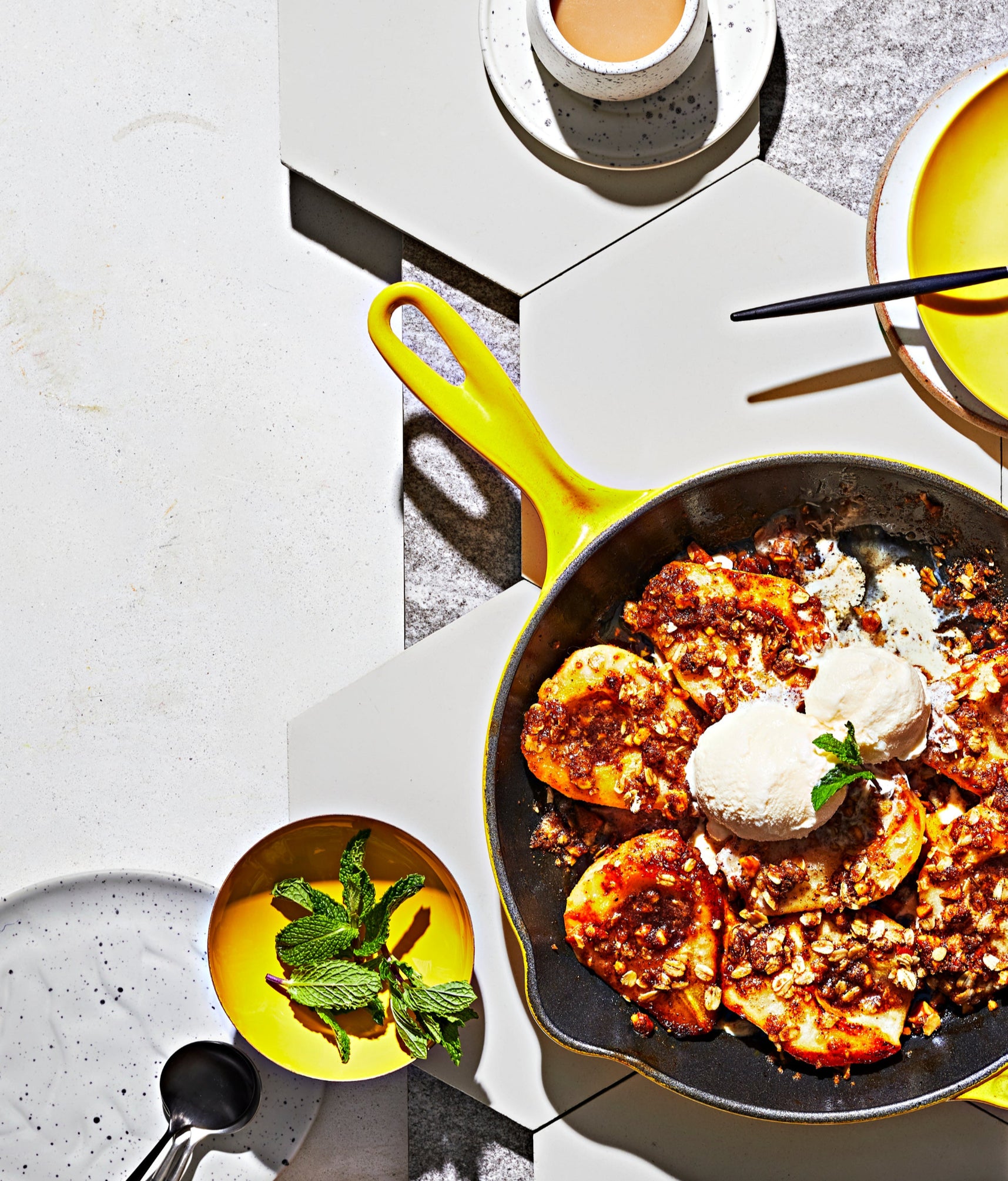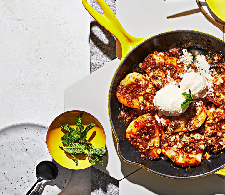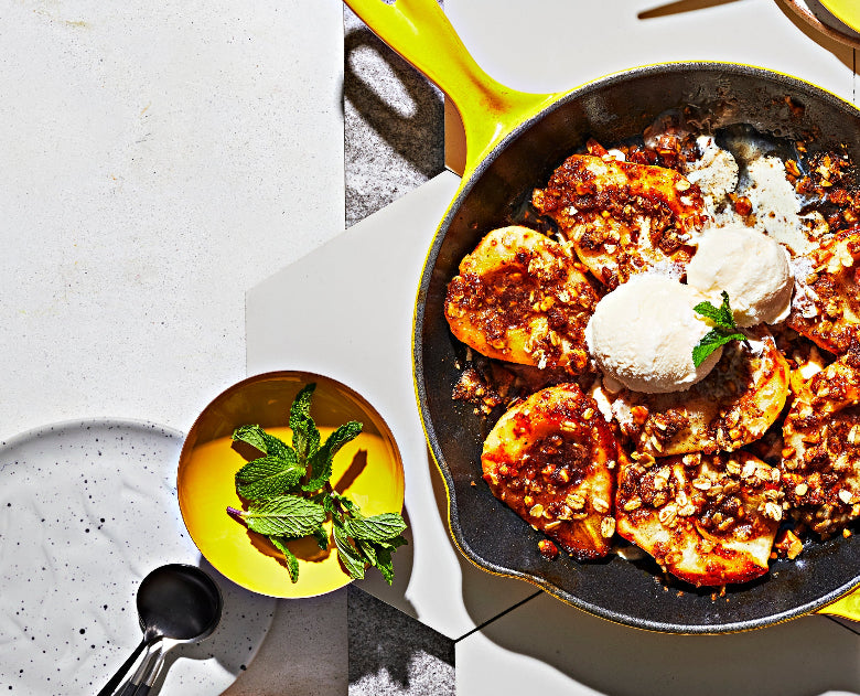 Just like this honey-roasted pear situation with a divine crumble that tastes a lot more intricate than the time it takes to prepare it. The trick? We rely once again on old faithful, the cast iron skillet that produces the perfect char and caramelization on the pears first on the stove and then in the oven. And no need to dirty a serving tray; we love to add a few scoops of vanilla bean ice cream right on top, plop this down in the middle of the table (carefully, it’s hot!) and let guests serve themselves.