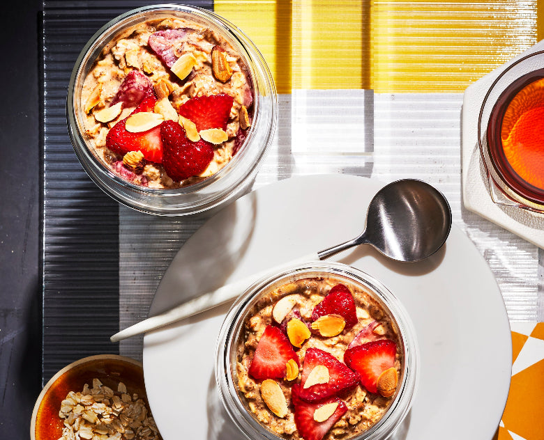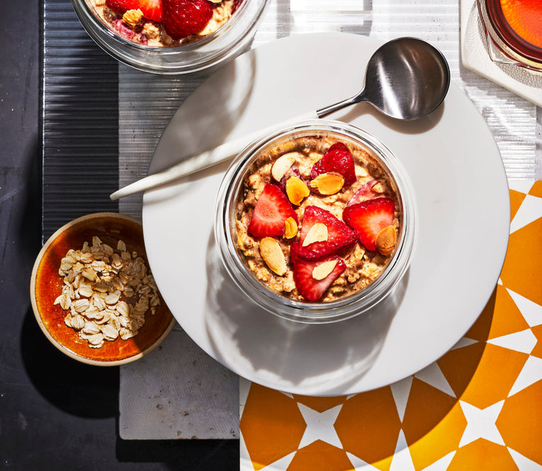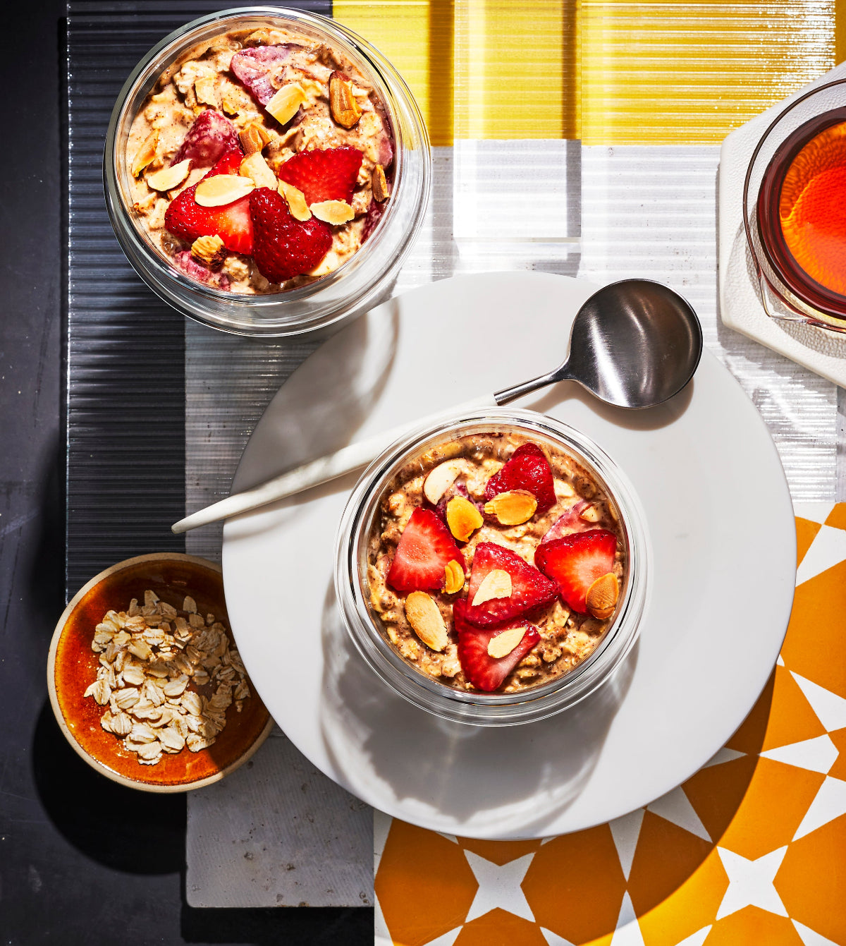 Packed with ingredients like almond butter and chia seeds, these overnight oats are packed with nutrients and good-for-you ingredients that will fuel you up and help you feel fuller longer. Prep a batch on Sunday evening and have delicious breakfasts (or snacks) all week long. We recommend reserving some sliced strawberries and toasted almonds to sprinkle on top for added texture and crunch.