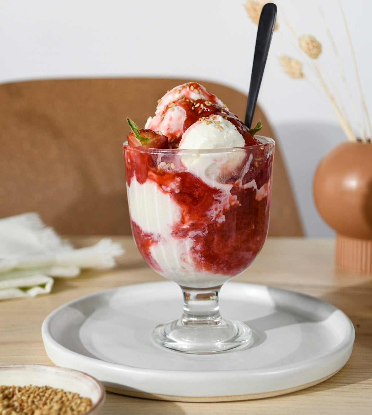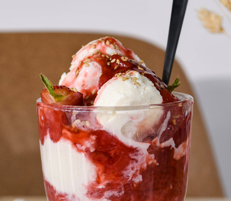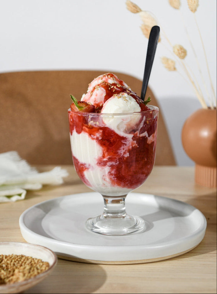 This dessert is all about letting the sweetness of the ripe strawberries shine with just a little coaxing and by gently cooking them with lemon juice and brown sugar. Spoon the sauce generously on the ice cream or frozen yogurt of your choice. To take it over the top, we love to sprinkle on some toasted sesame seeds. It may sound unusual, but the nutty flavor balances the sweetness of the fruit and gives the sundae great texture.