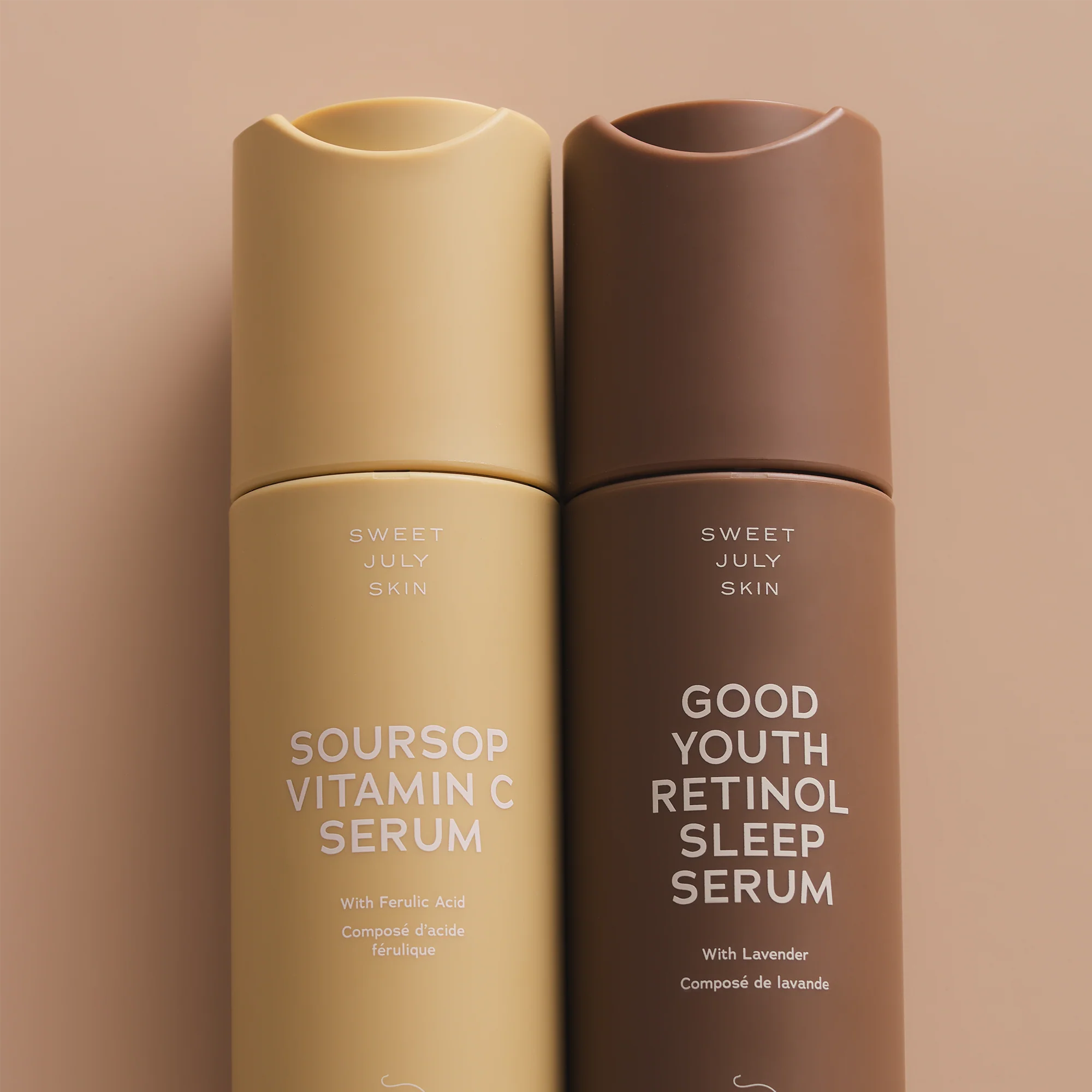Day + Night, Vitamin C and Retinol Serum SetA set of serums for your day and night skincare routine. For daytime, use our Soursop Vitamin C Serum for radiance paired with our Good Youth Retinol Sleep Serum at nighttime for youthful renewal. Soursop Vitamin C Serum- Soursop extract is rich in Vitamin...A set of serums for your day and night skincare routine. For daytime, use our Soursop Vitamin C Serum for radiance paired with our Good Youth Retinol Sleep Serum at nighttime for youthful renewal. Soursop Vitamin C Serum- Soursop extract is rich in Vitamin...