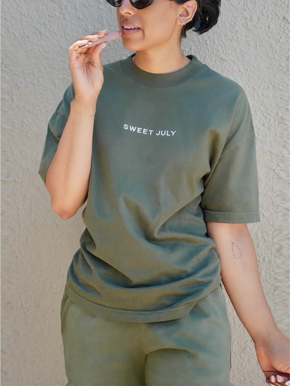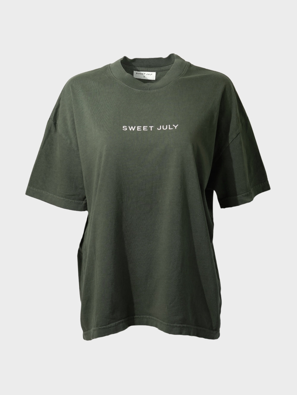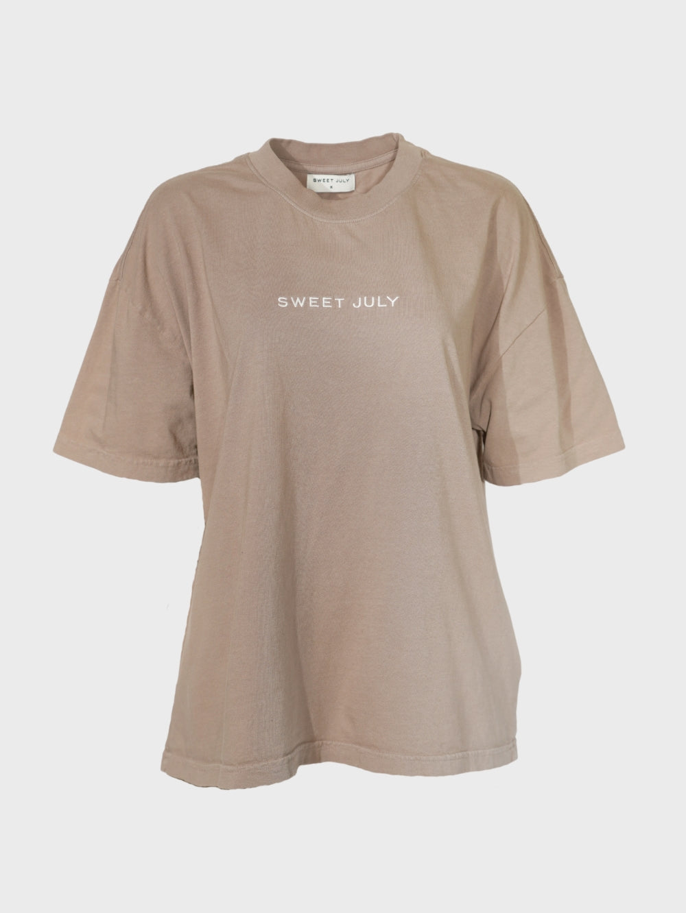 Our Sweet July Wordmark T-shirt is an oversized and effortless addition to your wardrobe. It feels like a broken-in favorite that’s been lived in. Its designed with a ribbed collar to provide a snug fit that will remain in structure over time, a roomy sleeve and torso for a relaxed fit.